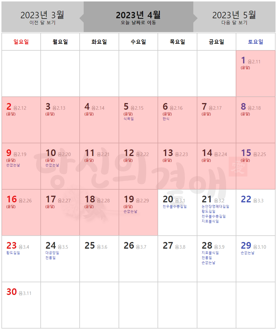 예약과 계약이 모두 잘 이뤄졌다면 문제 없겠지만, 그렇지 못한 경우는 윤달이 아니더라도, 매월 개장하기 좋은날이나 이장하기 좋은날, 손없는날을 손쉽게 달력으로 확인할 수 있도록 구현되어 있으니, 참고 해보시기 바랍니다.